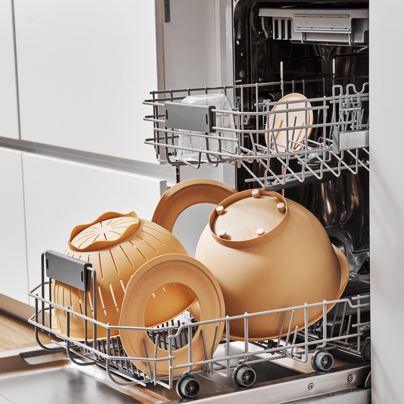 Набор подходит для микроволновой печи и посудомоечной машины. Миски, и дуршлаг вкладываются друг в друга и занимают мало места в шкафу.