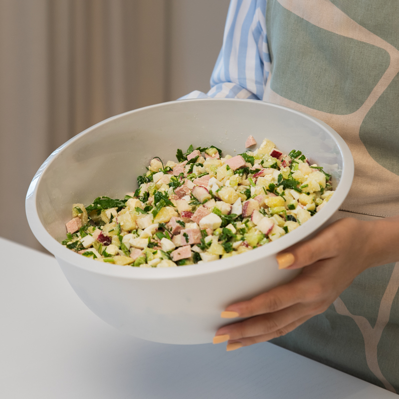 Миска пригодится когда захотите приготовить блинчики на завтрак для двоих или побаловать близких тортом и ароматными пирожками. У миски высокие борта и толстое сферическое дно. Если заденете дно миксером — всё будет в порядке. Миска подходит для всех ручных и автоматических блендеров и миксеров.