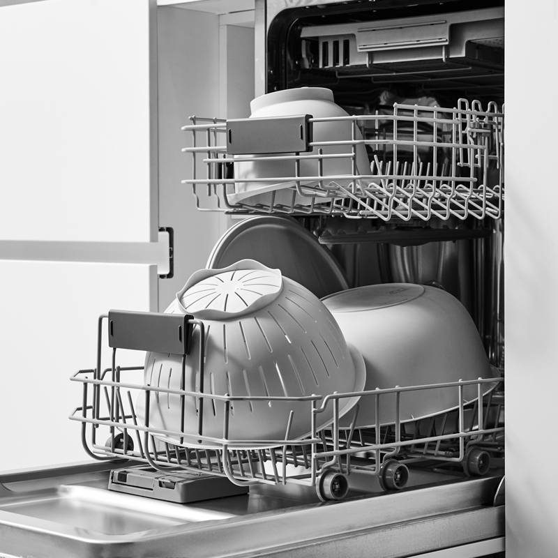 Набор подходит для микроволновой печи и посудомоечной машины. Миски, и дуршлаг вкладываются друг в друга и занимают мало места в шкафу.