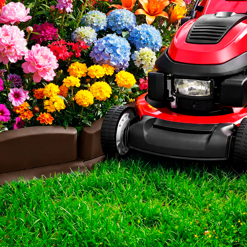 Снизу бордюра есть площадка для газонокосилки. Колесо косилки едет по прочной пластиковой площадке, не проваливаясь. Лезвие срезает траву по краю бордюра и не оставляет нескошенной полоски.