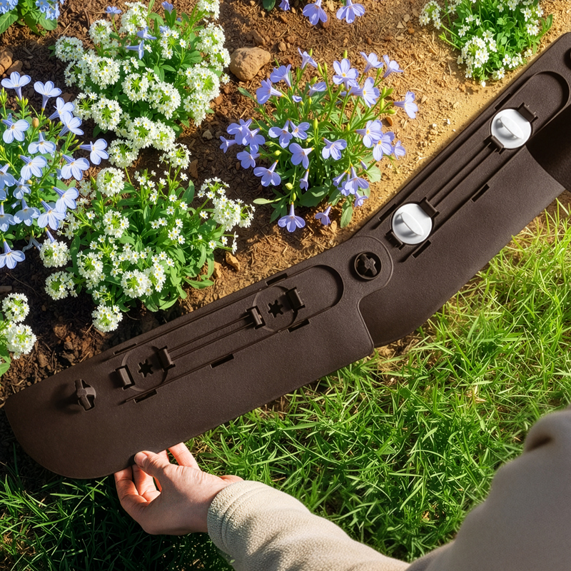 У бордюра гибкая конструкция. Можете сделать изогнутые, плавные границы между цветами и украсить клумбы разной формы. Бордюр легко повторит рельеф.