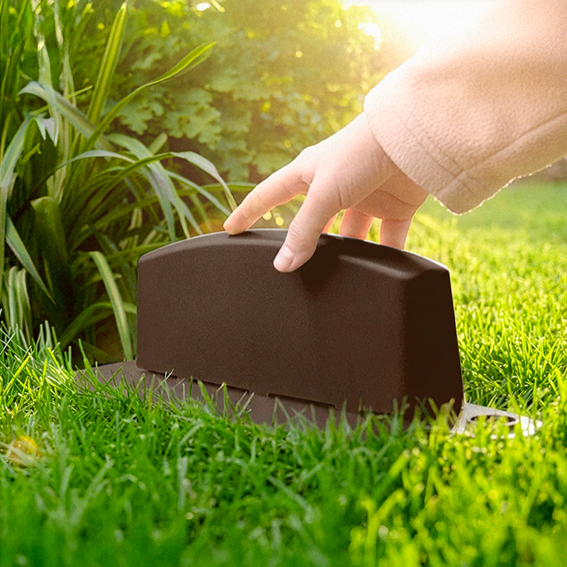 Для сборки садового бордюра не нужны дополнительные инструменты. Разместите несколько оснований бордюра и скрепите их между собой. Воткните по 2 колышка в каждое основание. Затем вставьте бордюр во все отверстия до щелчка.